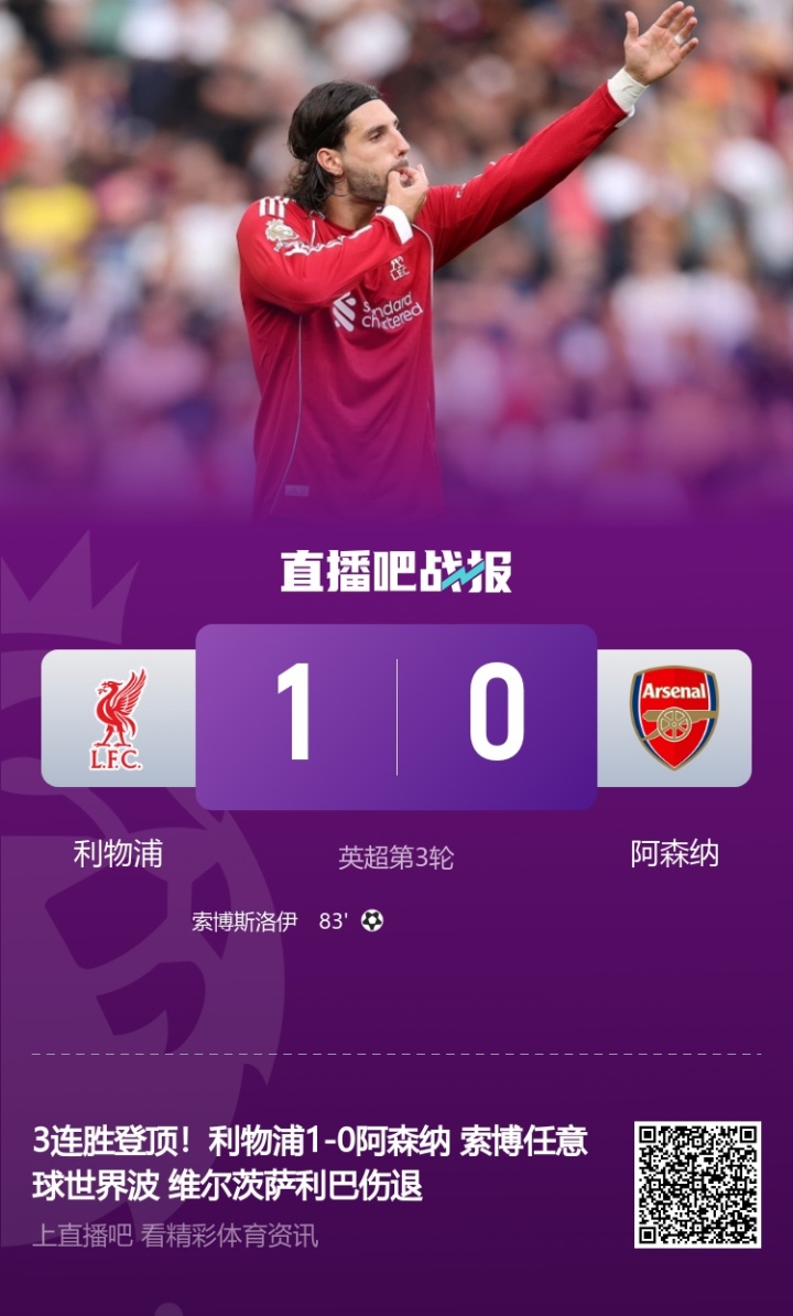 3连胜登顶!利物浦1-0阿森纳 索博定位球世界波 维尔茨萨利巴伤退德甲赛程2025赛程表