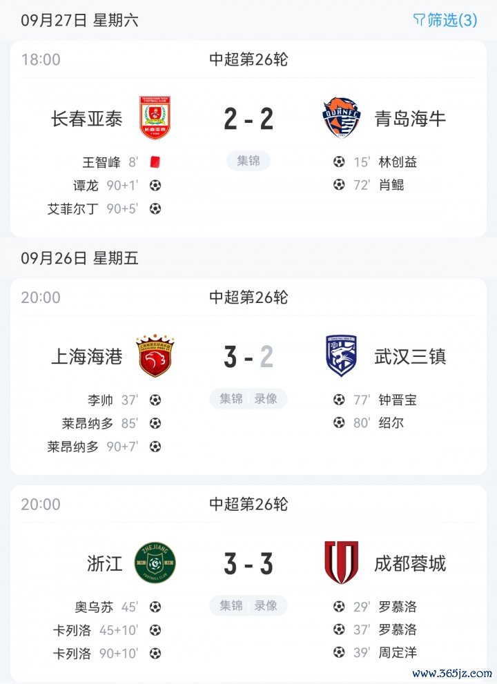 蓉城3-0领跑 情况下被浙江追成2-3,第100分钟浙江完成绝平