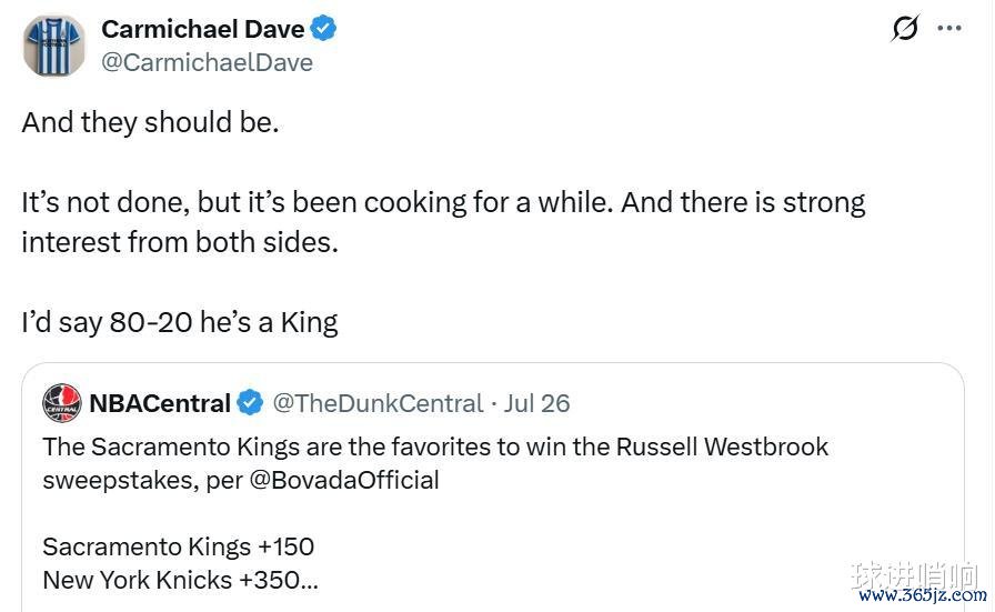 根据萨克拉门托电台Sactown Sports 1140主持人Carmichael Dave在节目中透露,威少与国王队彼此有意,双方有8成概率将联手。
