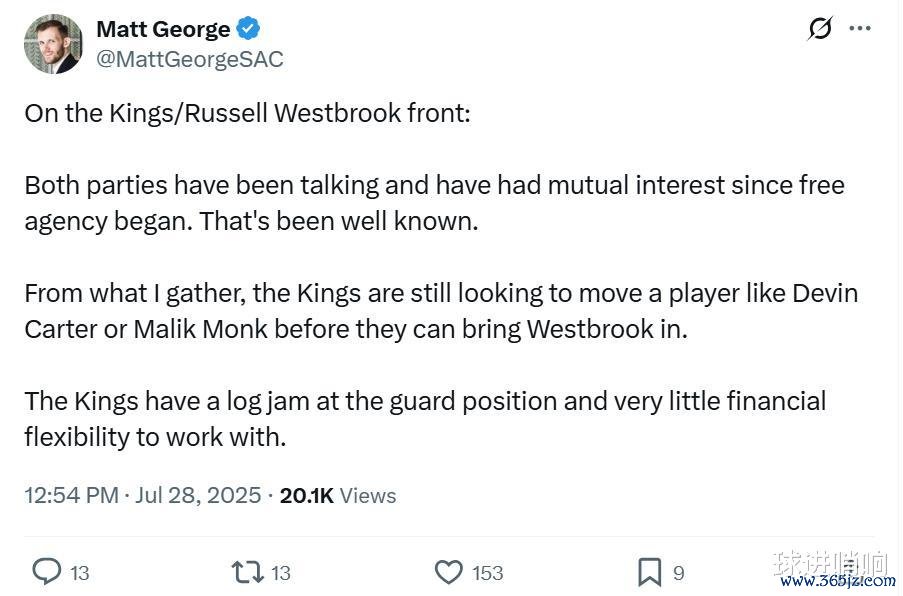 Matt George表示一切看起来并不容易, 国际米兰国王队大概率要交易德文-卡特或马利克-蒙克这样的球员, 德甲才能最终完成威少的签约。