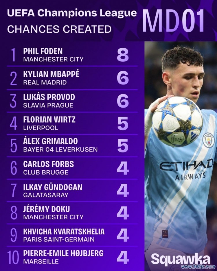 9月19日讯 欧冠首轮已经完赛,直播吧数据机构squakwa也统计了首轮的创造机会和创造重大机会情况。福登以8次创造机会居首。