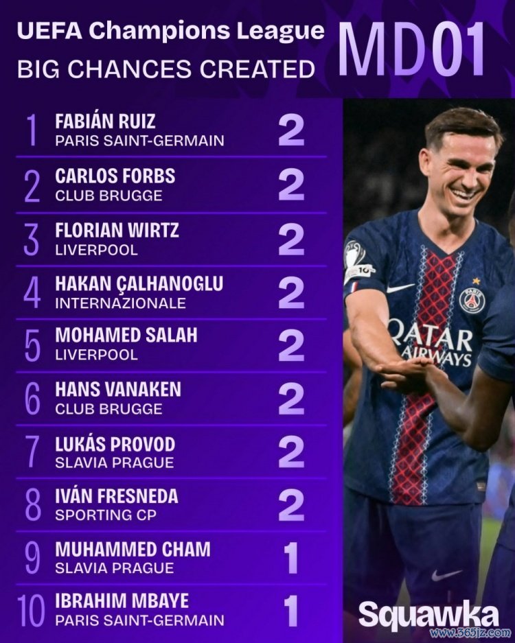 1.法比安-鲁伊斯(巴黎圣日耳曼),2次