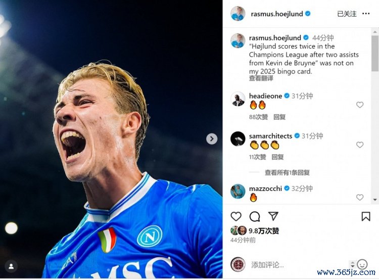 霍伊伦社媒晒出庆祝得分 的照片, 国际米兰体育直播并发文调侃:“霍伊伦在欧冠赛事 中连进两球, 德甲还都是德布劳内的助功 ——这完全不在我2025年的剧本之中。”