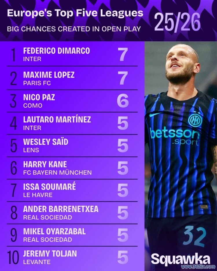 10月9日讯 Squawka统计了球员本赛季在五大职业联赛 运动活动 战中创造重大机会的次数,并列出榜单, 国际米兰体育直播迪马尔科、洛佩斯7次居首, 德甲尼科-帕斯6次第三。