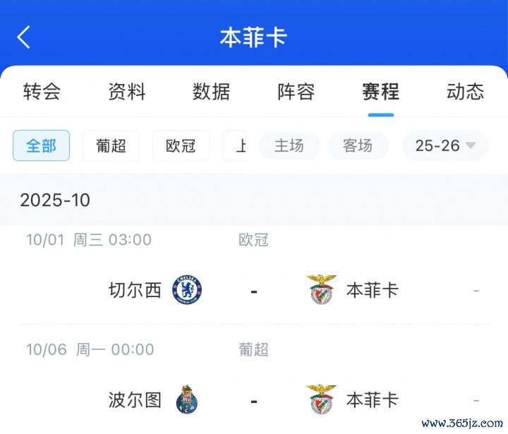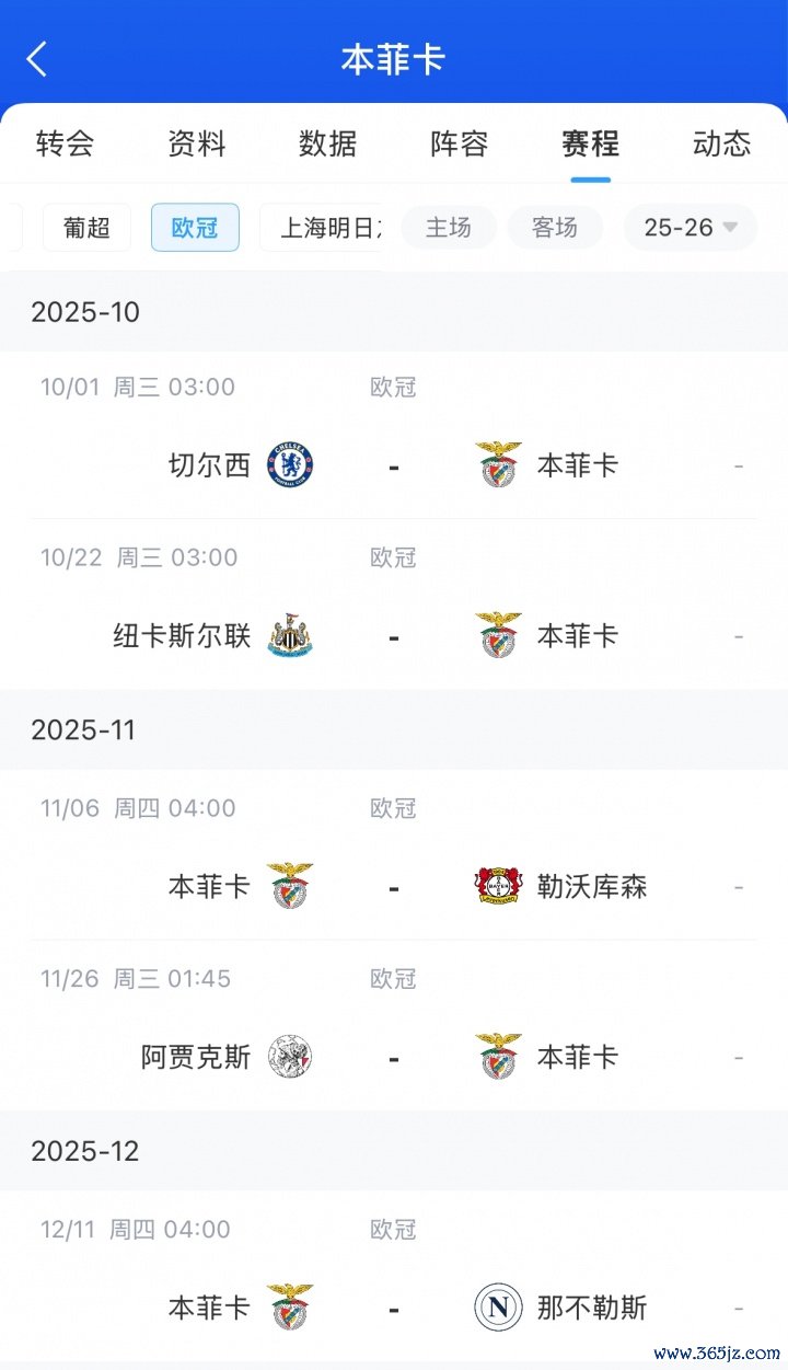 本菲卡首轮欧冠遭遇阿塞拜疆球队卡拉巴赫逆转。接下来本菲卡在欧冠会面对切尔西(穆帅前东家)、纽卡、勒沃库森、阿贾克斯、那不勒斯、尤文、皇马(穆帅前东家)。