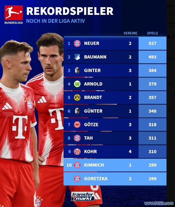 9月26日讯 德国转会市场盘点了德甲现役球员联赛出场数,诺伊尔以527场居首, 国际米兰足球直播基米希、格雷茨卡均299场闯进前10, 德甲即将迎来300场里程碑。