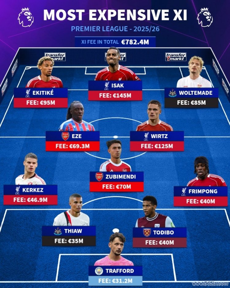 前场球员:埃基蒂克(利物浦,9500万)、伊萨克(利物浦,1.45亿)、沃尔特马德(纽卡, 国际米兰8500万)