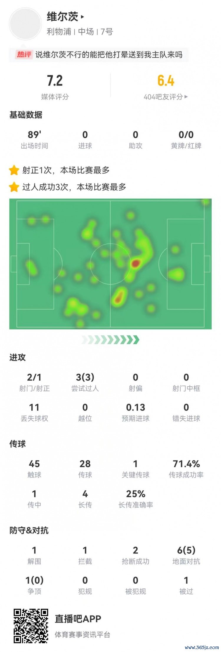 9月1日讯 利物浦在本轮焦点战1-0致胜球 阿森纳, 国际米兰体育直播维尔茨本场数据如下: