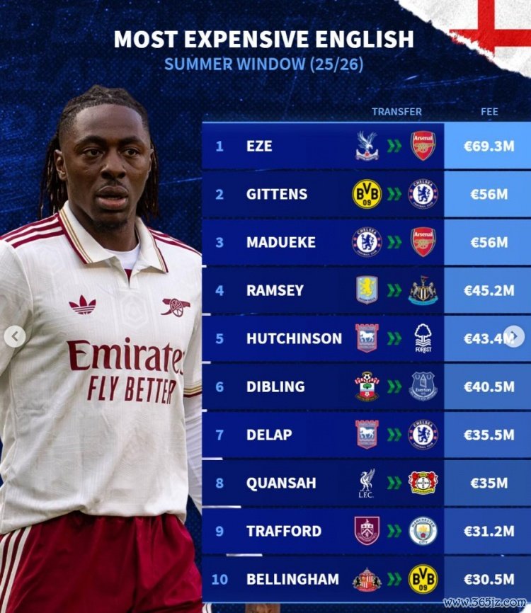 9月8日讯 今夏主流职业联赛 转会窗已经关闭,直播吧《转会市场》也列出了英格兰球员的今夏转会费最贵情况。
