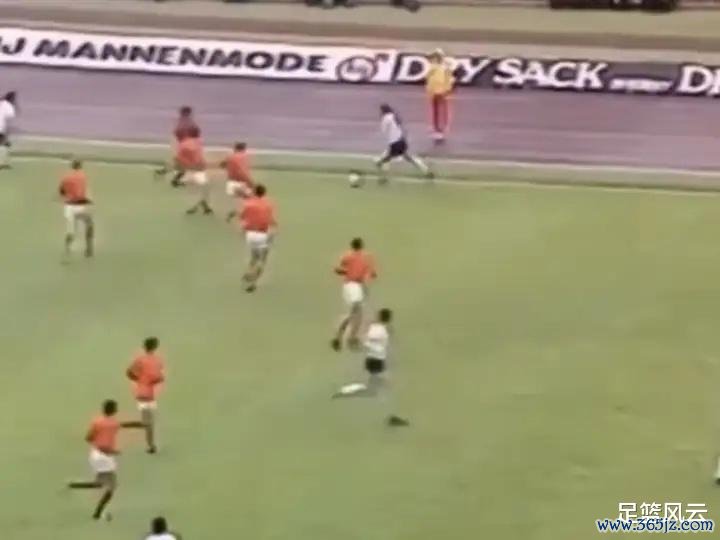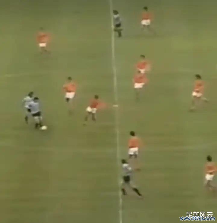 就是对方球员拿球,然后荷兰球员一窝蜂一堆人往前冲,感觉猛虎扑食的竞技状态 ,这样的镜头放到现在会有点奇怪。