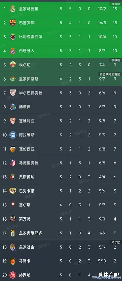 除了皇马和巴萨保持不败, 德甲埃尔切是第三支保持不败金身的球队,英超新闻网本轮在主场作战 1-0小胜升班马皇家奥维耶多,安德烈-席尔瓦攻入了制胜球,目前以2胜3平积9分暂列第5名。比利亚雷亚尔和西班牙人都是3胜1平1负积10分暂列第3和第4名。