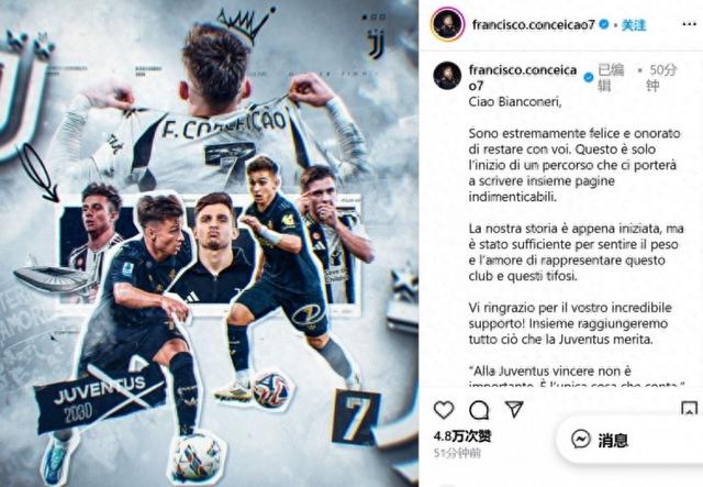 “我们的故事才刚刚开始, 德甲直播吧但这已经足以让我感受到代表这个俱乐部和这些球迷的分量与爱。感谢你们难以置信的支持!我们将一起达成尤文应得的一切。”
